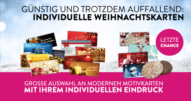 „Merry Christmas and a happy New Year“ – wünschen Sie Ihrer Familie, Freunden sowie Kunden, Vertretern und Lieferanten ein besinnliches Weihnachtsfest und alles Gute für das neue Jahr mit edlen und einzigartigen Weihnachtskarten der DRUCKHELDEN. In unserem Sortiment finden Sie eine Vielzahl an festlichen Motiven in brillanter Druck- und Farbqualität. Um unseren Kunden den gewohnt hohen Helden-Qualitätsstandard bieten zu können, erfolgt die Produktion Ihrer Weihnachtskarten unter strengster Kontrolle erfahrener Drucker - natürlich direkt vor Ort in Eigenproduktion.